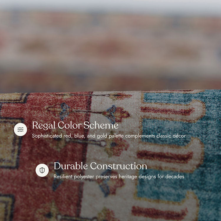 Deep reds, navy blues, sky blues, ivory, and gold accents are designed to resist fading. The colors stay vibrant even after multiple washes and years of foot traffic.