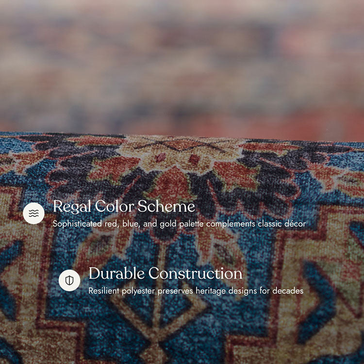 Deep reds, navy blues, sky blues, ivory, and gold accents are designed to resist fading. The colors stay vibrant even after multiple washes and years of foot traffic.