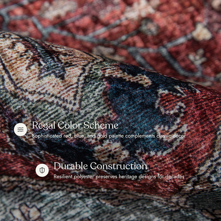 Deep reds, navy blues, sky blues, ivory, and gold accents are designed to resist fading. The colors stay vibrant even after multiple washes and years of foot traffic.
