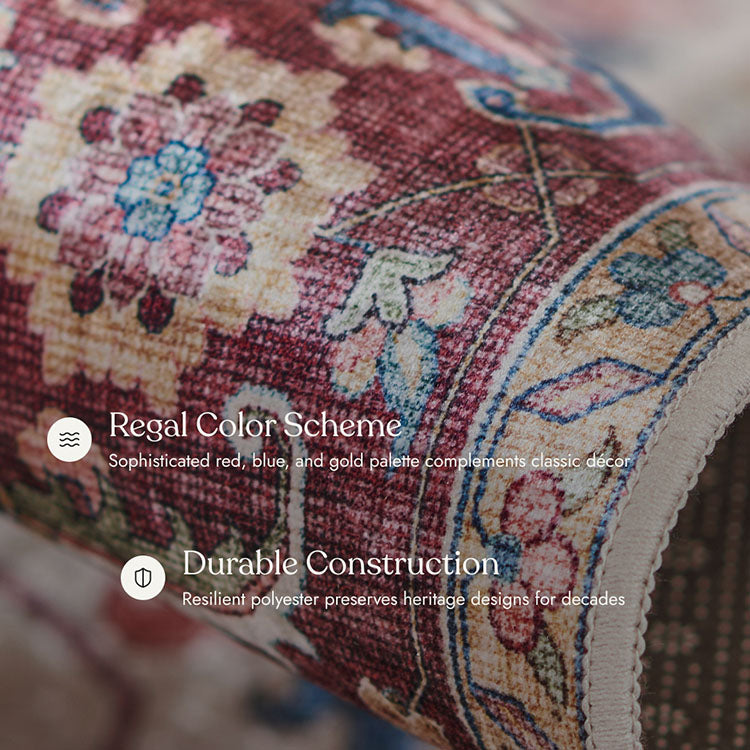 Deep reds, navy blues, sky blues, ivory, and gold accents are designed to resist fading. The colors stay vibrant even after multiple washes and years of foot traffic.